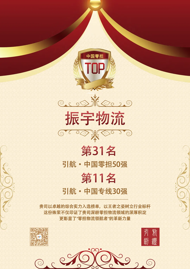 【喜報】振宇物流榮膺《2025引航·中國零擔(dān)50強排行榜、2025引航·中國專線30強排行榜》!