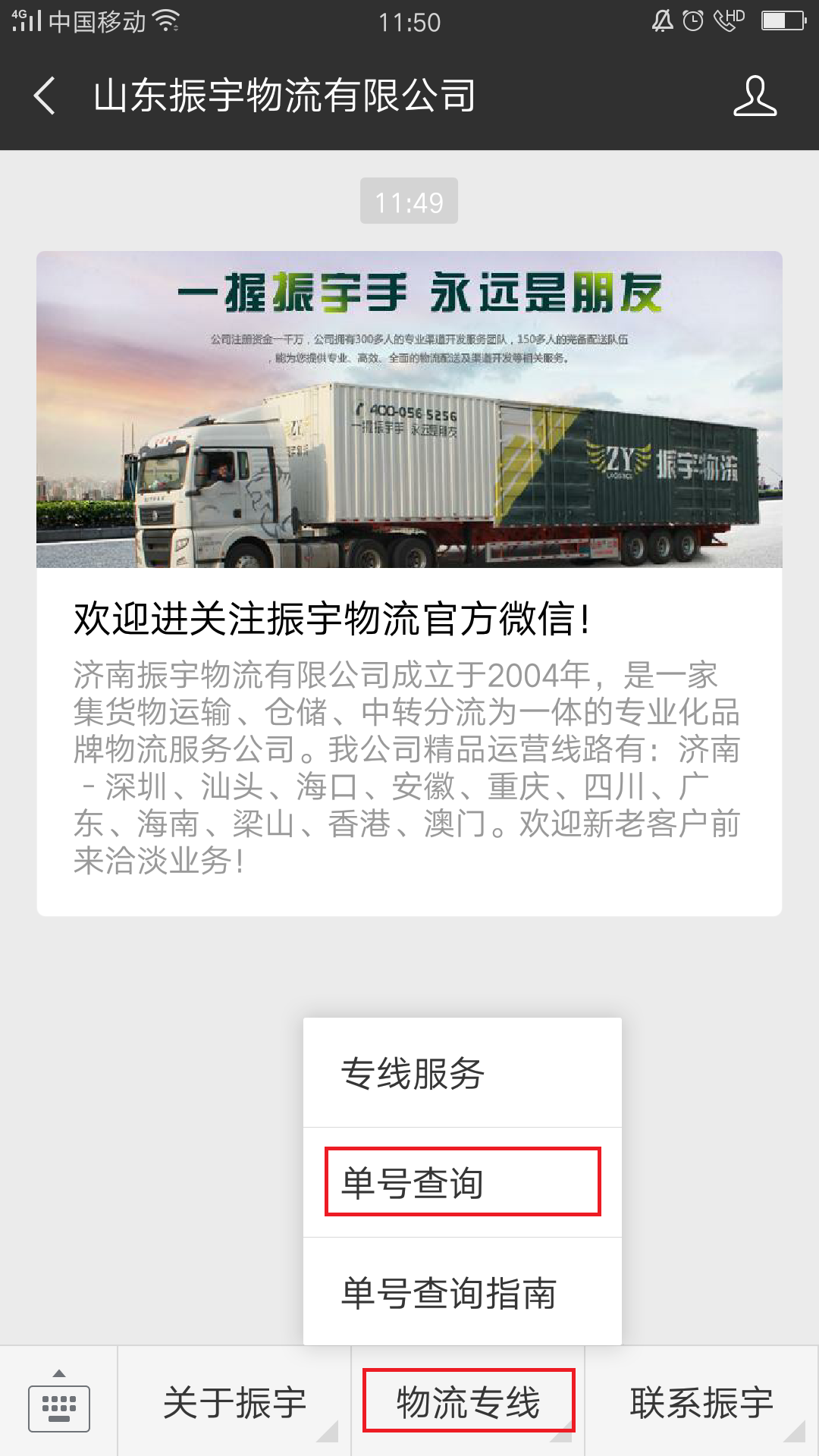 3.進(jìn)入公眾號(hào),點(diǎn)擊“物流專線——單號(hào)查詢”欄目。