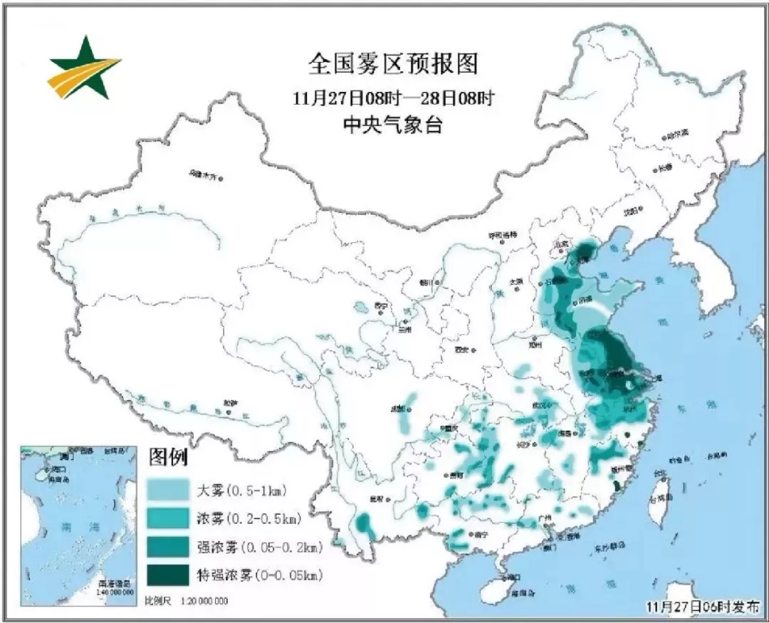 中央氣象臺(tái)11月27日06時(shí)繼續(xù)發(fā)布大霧橙色預(yù)警,27日早晨至28日早晨,華北中東部、黃淮東部和南部、江淮、江漢平原的部分地區(qū)將有大霧,其中河北東部、山東西南部、安徽東部、江蘇、上海、浙江北部等地有濃霧或強(qiáng)濃霧,局地有能見度不足50米的特強(qiáng)濃霧。預(yù)計(jì)華東地區(qū)的大霧天氣會(huì)一直持續(xù)到12月2日,長達(dá)一周。