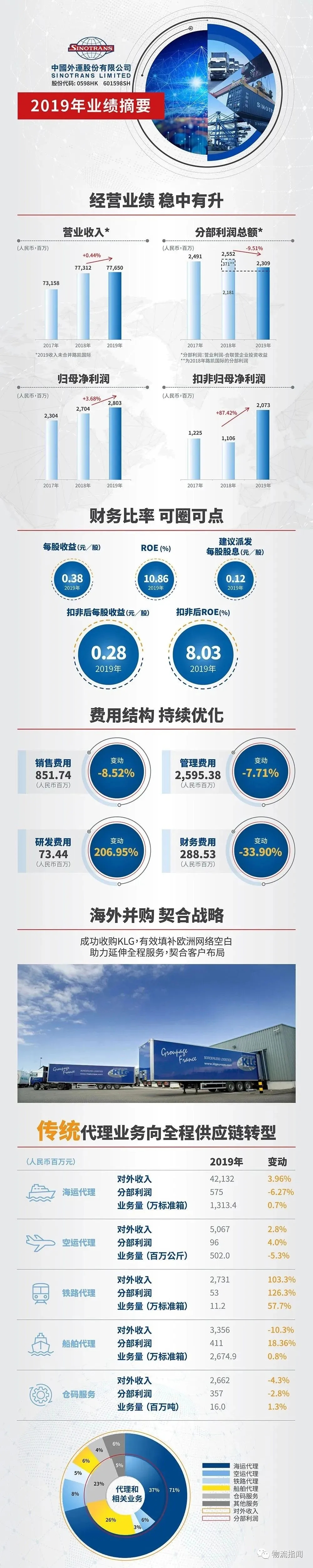 據(jù)悉,2019年,中國外運實現(xiàn)營業(yè)收入776.50億元,同比增長0.44%(可比口徑下實現(xiàn)增長2.4%);分部利潤實現(xiàn)23.09億,可比口徑下實現(xiàn)增長5.9%。實現(xiàn)歸母凈利潤28.03億元,同比增長3.68% ;實現(xiàn)扣非后的歸母凈利潤20.73億元,同比增長87.42%。每股收益為0.38元人民幣??鄯呛蟮腞OE增長了3.08個百分點。