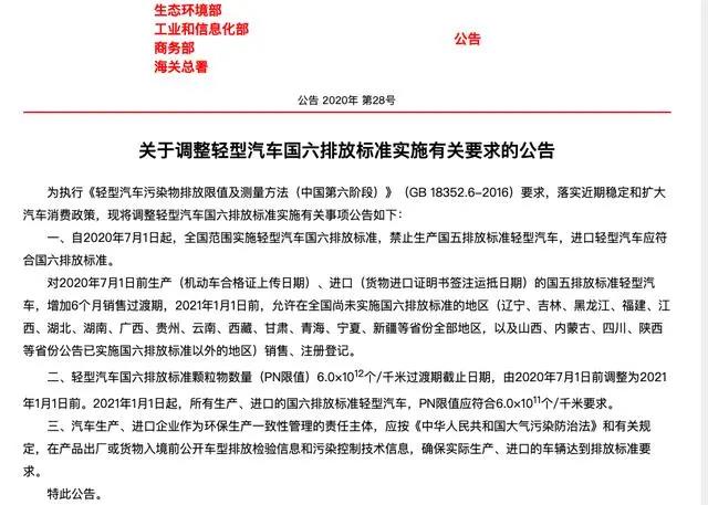 5月15日,據(jù)生態(tài)環(huán)境部網(wǎng)站消息,生態(tài)環(huán)境部等四部門聯(lián)合發(fā)布關(guān)于調(diào)整輕型汽車國六排放標(biāo)準(zhǔn)實(shí)施有關(guān)要求的公告,自2020年7月1日起,全國范圍實(shí)施輕型汽車國六排放標(biāo)準(zhǔn),禁止生產(chǎn)國五排放標(biāo)準(zhǔn)輕型汽車,進(jìn)口輕型汽車應(yīng)符合國六排放標(biāo)準(zhǔn)。
