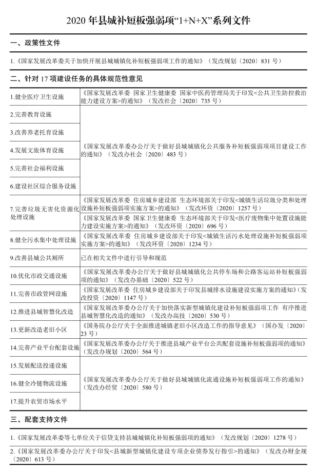 2020年5月29日,國(guó)家發(fā)展改革委印發(fā)《關(guān)于加快開展縣城城鎮(zhèn)化補(bǔ)短板強(qiáng)弱項(xiàng)工作的通知》,聚焦縣城及縣級(jí)市城區(qū),兼顧鎮(zhèn)區(qū)常住人口10萬(wàn)以上的非縣級(jí)政府駐地特大鎮(zhèn)、2015年以來(lái)“縣改區(qū)”“市改區(qū)”形成的地級(jí)及以上城市市轄區(qū),將公共服務(wù)設(shè)施、環(huán)境衛(wèi)生設(shè)施、市政公用設(shè)施、產(chǎn)業(yè)培育設(shè)施4大領(lǐng)域共17項(xiàng)建設(shè)任務(wù)作為建設(shè)重點(diǎn),明確了總體要求、主要任務(wù)、要素保障和組織實(shí)施方式,公布了縣城城鎮(zhèn)化補(bǔ)短板強(qiáng)弱項(xiàng)項(xiàng)目范疇和縣城新型城鎮(zhèn)化建設(shè)示范地區(qū)名單。
