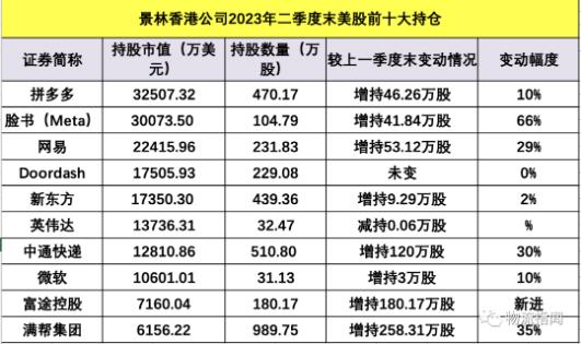 根據(jù)13F文件,截至6月30日,景林資產(chǎn)在美股持有28只證券,合計(jì)持倉(cāng)市值達(dá)到20.69億美元(約合人民幣149.76億元),環(huán)比增幅約20%。具體來(lái)看,二季度末其美股前十大重倉(cāng)股分別是拼多多、臉書(shū)母公司Meta、網(wǎng)易、Doordash、新東方、英偉達(dá)、中通快遞、微軟、富途控股、滿幫集團(tuán),中概股依舊占主導(dǎo)。