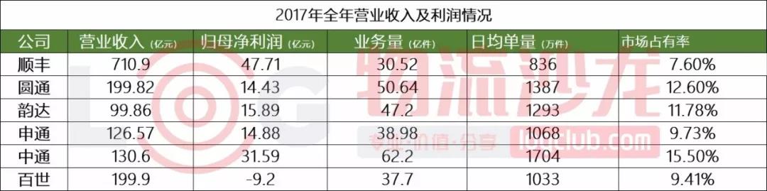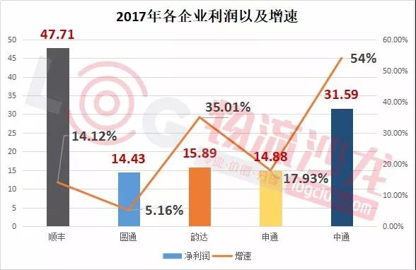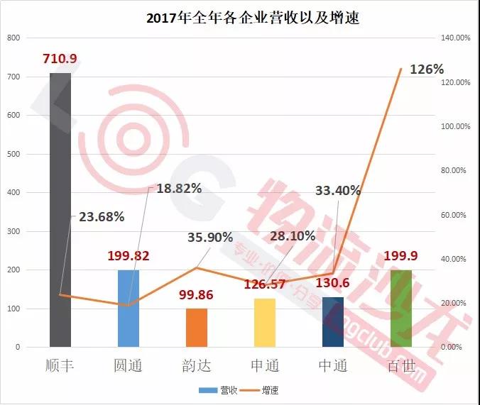 我們可以從營收增速來看看各家企業(yè)表現力。具體來看,百世第一,增幅高達126%,其次是韻達、中通、申通,分別是35.9%、33.4%、28.1%,都高于郵政局公布的2017年全年快遞收入增長速度(2017年行業(yè)增速為24.7%)。