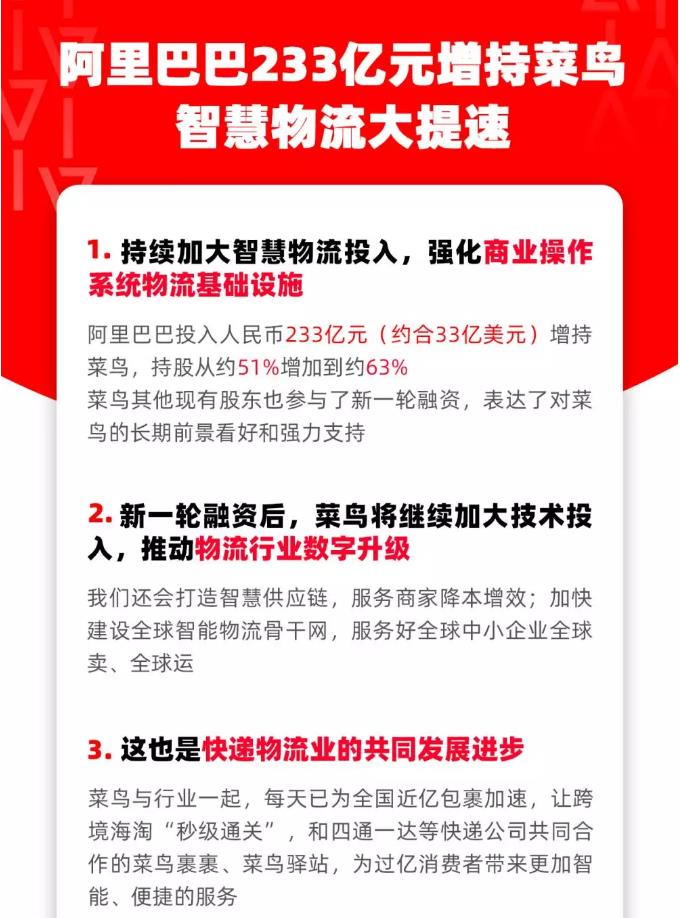 阿里巴巴集團(tuán)11月8日宣布,為持續(xù)加大智慧物流投入,強(qiáng)化商業(yè)操作系統(tǒng)物流基礎(chǔ)設(shè)施,已領(lǐng)銜完成對(duì)菜鳥(niǎo)網(wǎng)絡(luò)新一輪增資。阿里巴巴通過(guò)增資和購(gòu)買(mǎi)老股的方式,投入人民幣233億元(約合33億美元),持有菜鳥(niǎo)股權(quán)從約51%增加到約63%。菜鳥(niǎo)其他現(xiàn)有股東也參與了新一輪融資,表達(dá)了對(duì)菜鳥(niǎo)的長(zhǎng)期前景看好和強(qiáng)力支持。